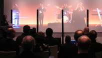A projector and a computer take care of the pictures and sound (3.1) and we have a Live guitarist and an extra moderator.